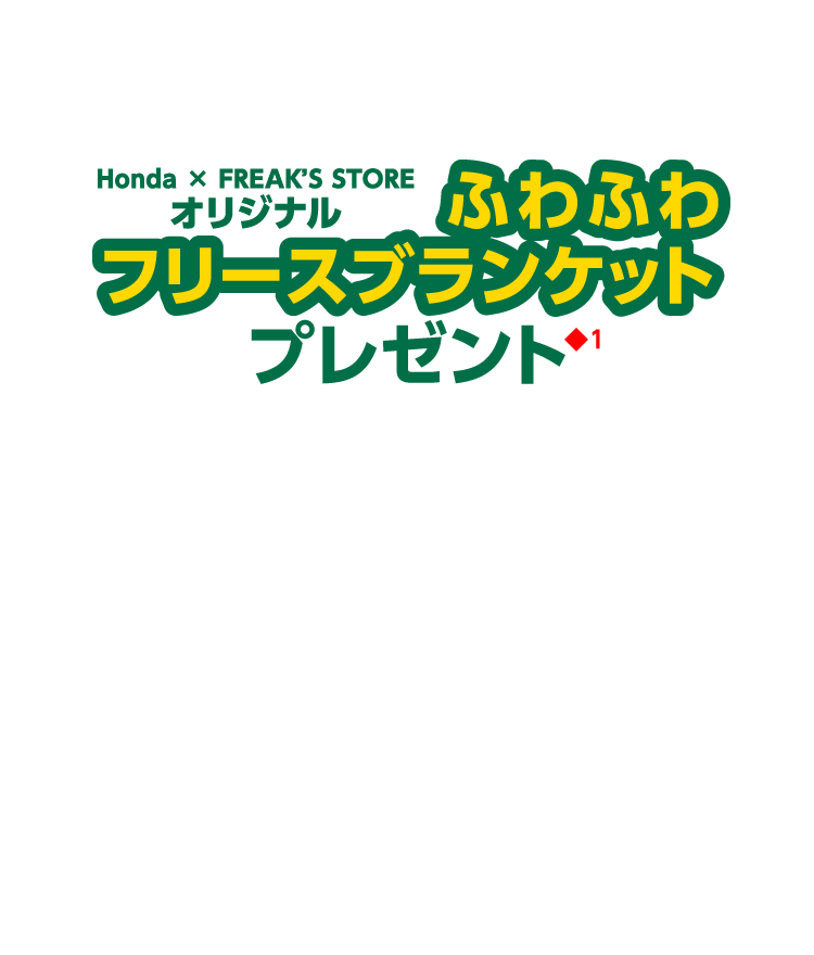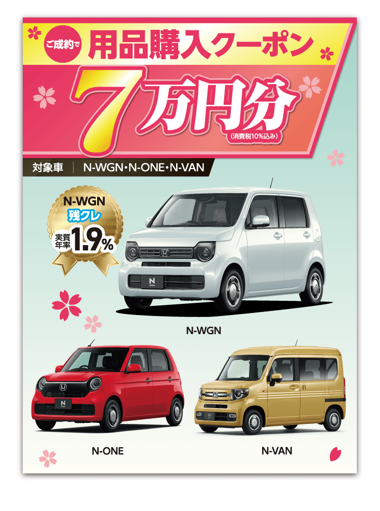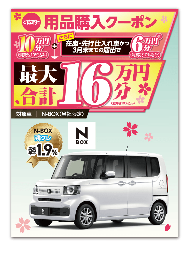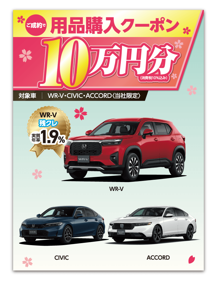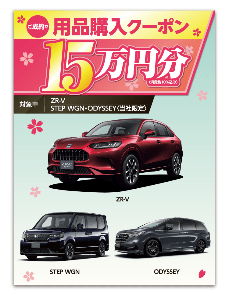 ●各キャンペーンは予告なく終了する場合がございます。 ●期間中に対象車をご成約かつ登録・届出いただいた方が対象となります。 一部のタイプ・カラーによっては登録・届出までに時間を要するため対象とならない場合がございます。●各プレゼントキャンペーン権利の他人への譲渡や換金、値引きはできません。 ●他のキャンペーンと併用できない場合がございます。 ●詳しくは営業スタッフまでお問い合わせください。 ●当社指定、Honda純正用品ご購入の際にご利用いただけます。●プレゼント金額は、用品代+取付工賃の合計分となります。代金がプレゼント金額に満たない場合の返金、値引きはありません。 ●プレゼント金額を超える代金はご成約者様のご負担とさせていただきます。[当社限定キャンペーンについて]●このキャンペーンは当社のみで実施しております。