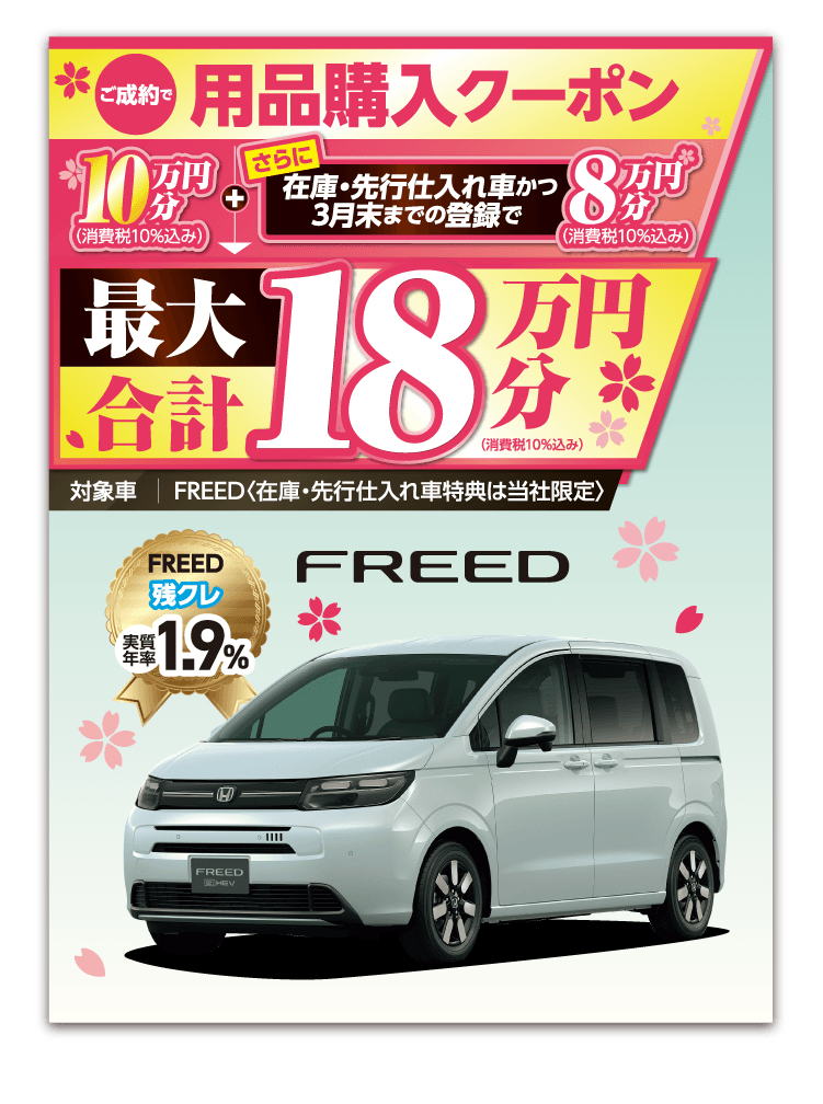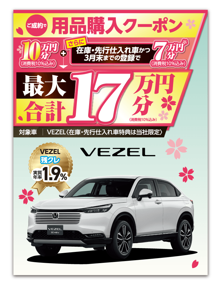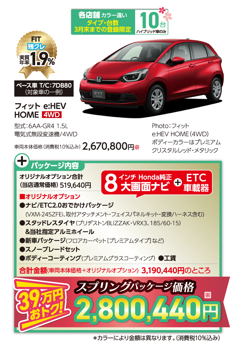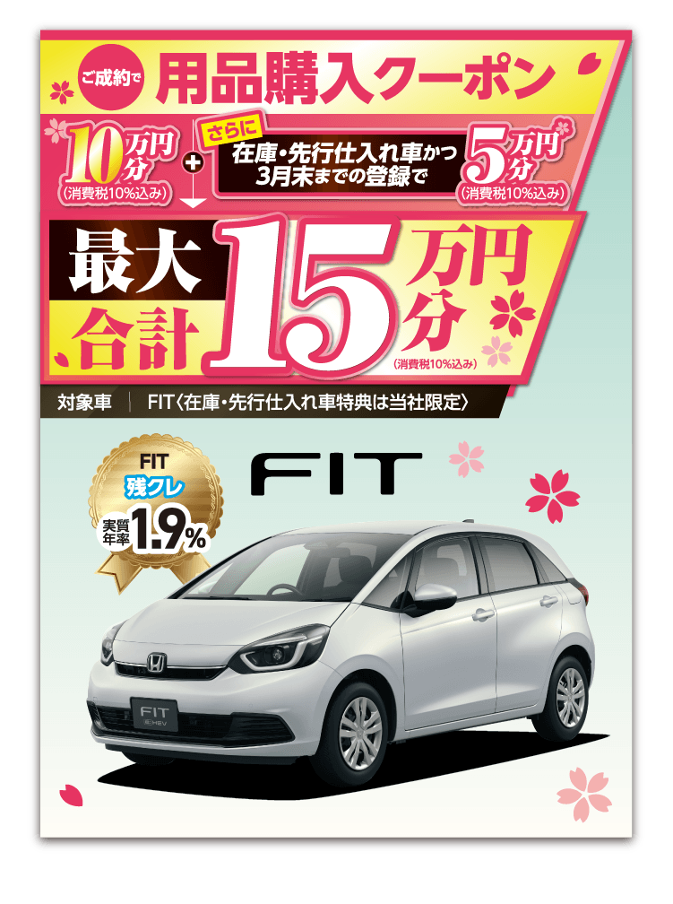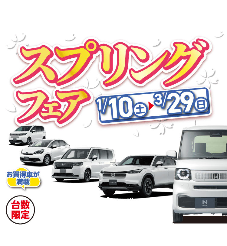 ●期間中に対象車を新車でご成約かつ3月末までにご登録(届出)いただいた方が対象となります。 ●装備内容は車種により異なります。 ●他のキャンペーンと併用できない場合があります。 ●ETC2.0車載器を使用するには、別途決済用のETCカード、セットアップ作業(セットアップ費用)が必要となります。 ●パッケージ内容にはタイヤ整備料金は含まれておりません。〈FITの場合、全て税込〉組み換え・バランス(1本/1,650円)、脱着(4本/2,750円)、廃タイヤ処理(1本/440円) ※車種により金額が異なる場合がありますので、詳しくは営業スタッフまでお問い合わせください。