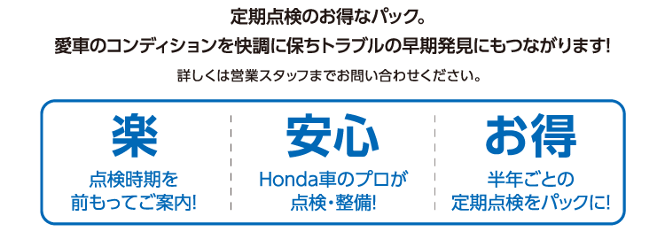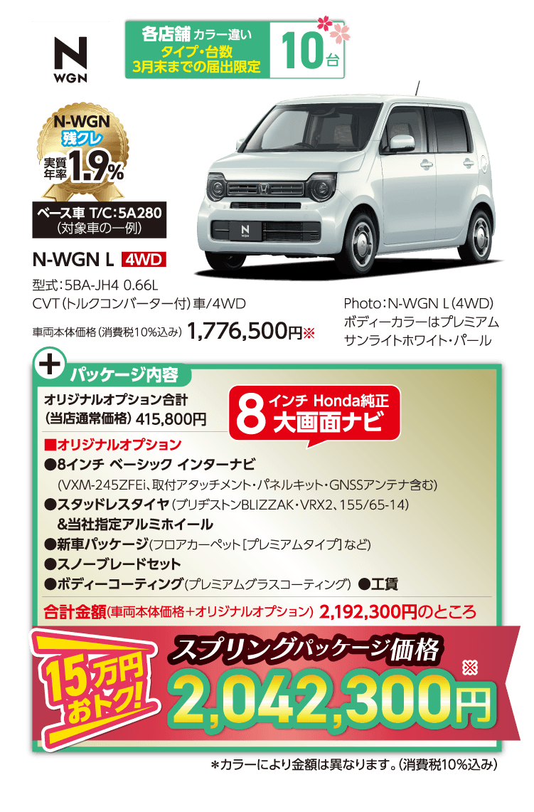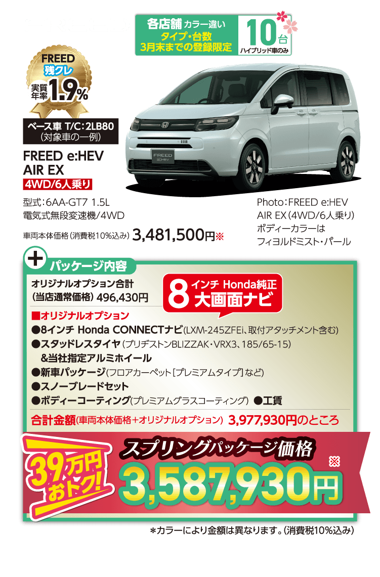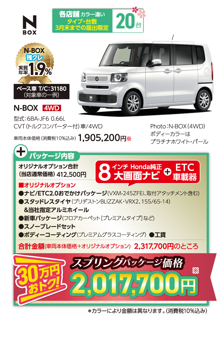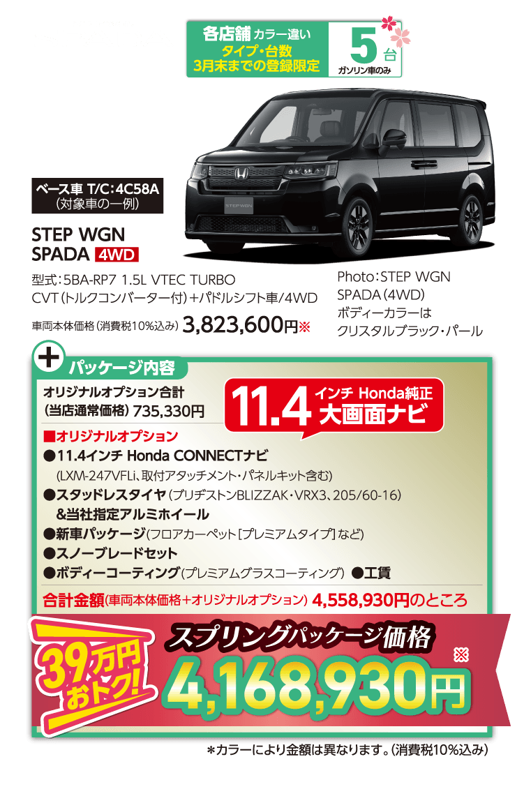 ●期間中に対象車を新車でご成約かつ3月末までにご登録(届出)いただいた方が対象となります。 ●装備内容は車種により異なります。 ●他のキャンペーンと併用できない場合があります。 ●ETC2.0車載器を使用するには、別途決済用のETCカード、セットアップ作業(セットアップ費用)が必要となります。 ●パッケージ内容にはタイヤ整備料金は含まれておりません。〈FITの場合、全て税込〉組み換え・バランス(1本/1,650円)、脱着(4本/2,750円)、廃タイヤ処理(1本/440円) ※車種により金額が異なる場合がありますので、詳しくは営業スタッフまでお問い合わせください。